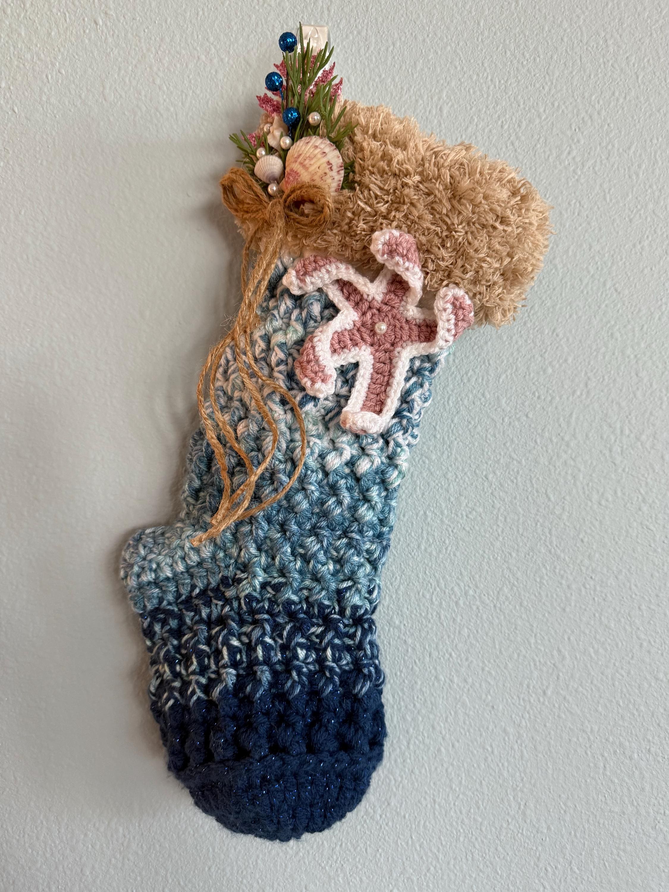*Stocking works up to be an oversized stocking - approximately 19" tall from rim to toe, using a 8mm hook and 2 strands of 4 weight yarn.
