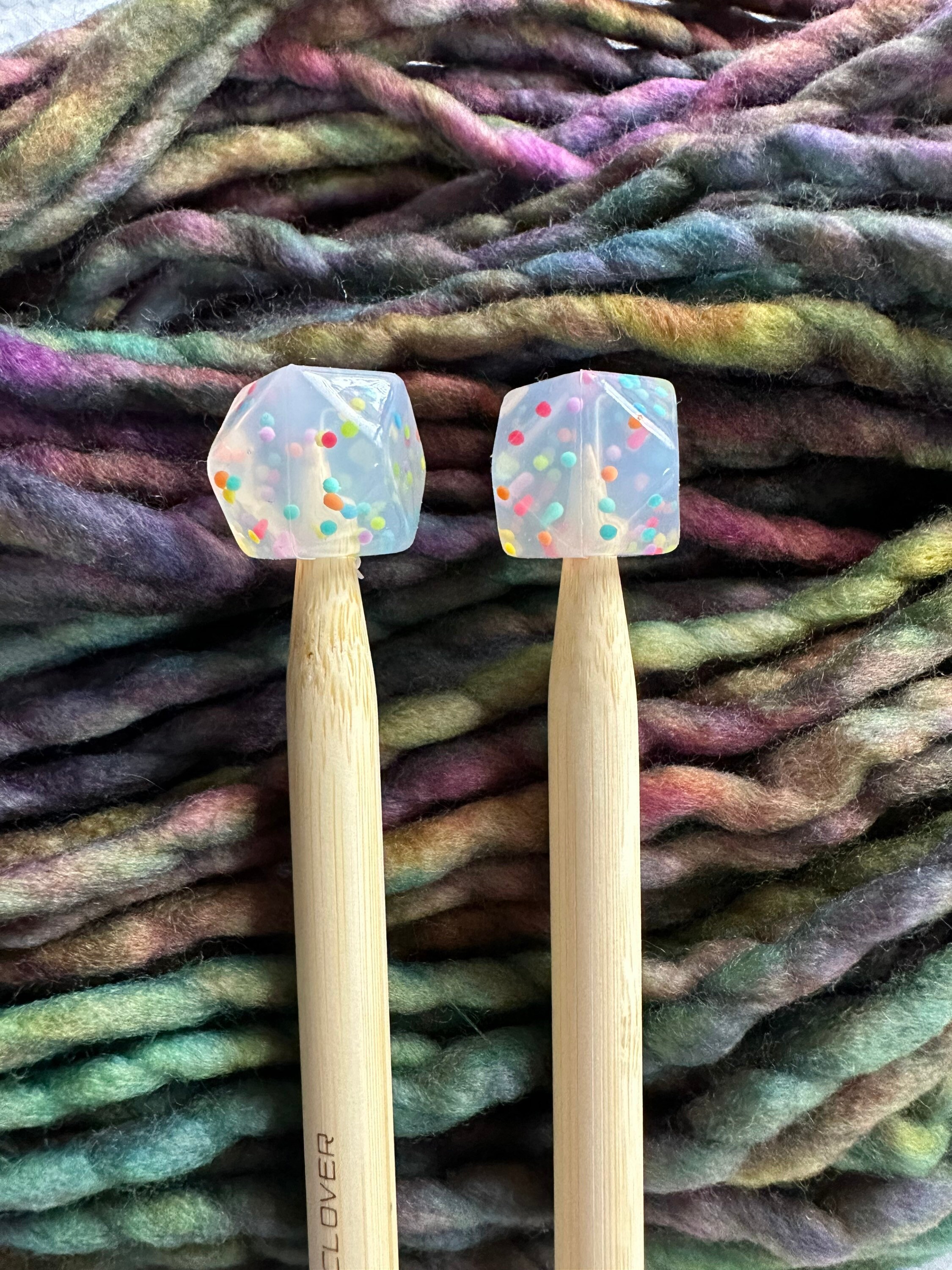 Super cute stitch stoppers that prevent your knitting stitches from falling off your needle when not in use! Also protects the tips from snagging anything while the project is laid down!