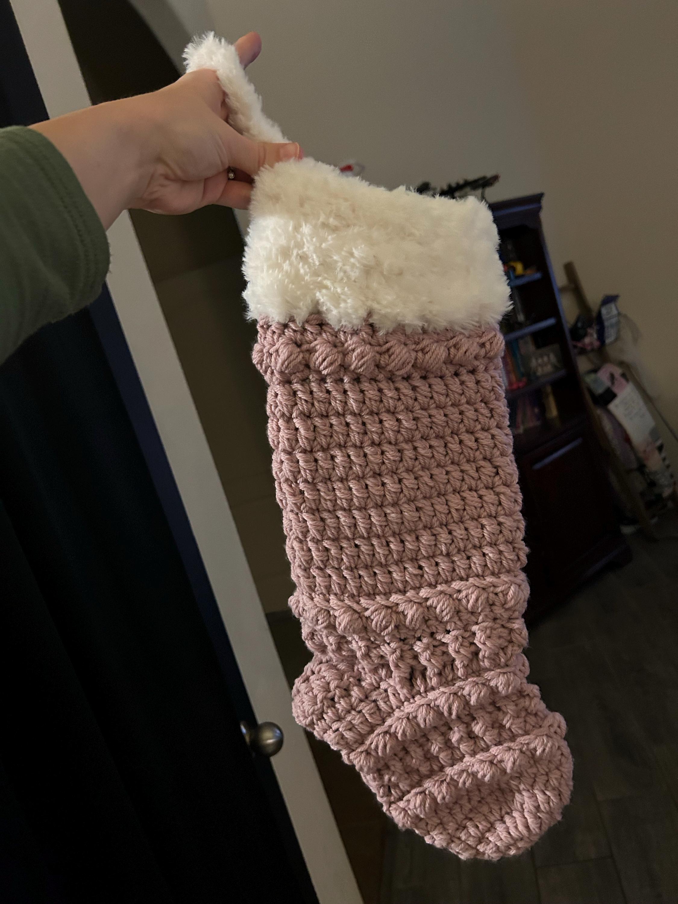 *Stocking works up to be an oversized stocking - approximately 19" tall from rim to toe, using a 8mm hook and 2 strands of 4 weight yarn.