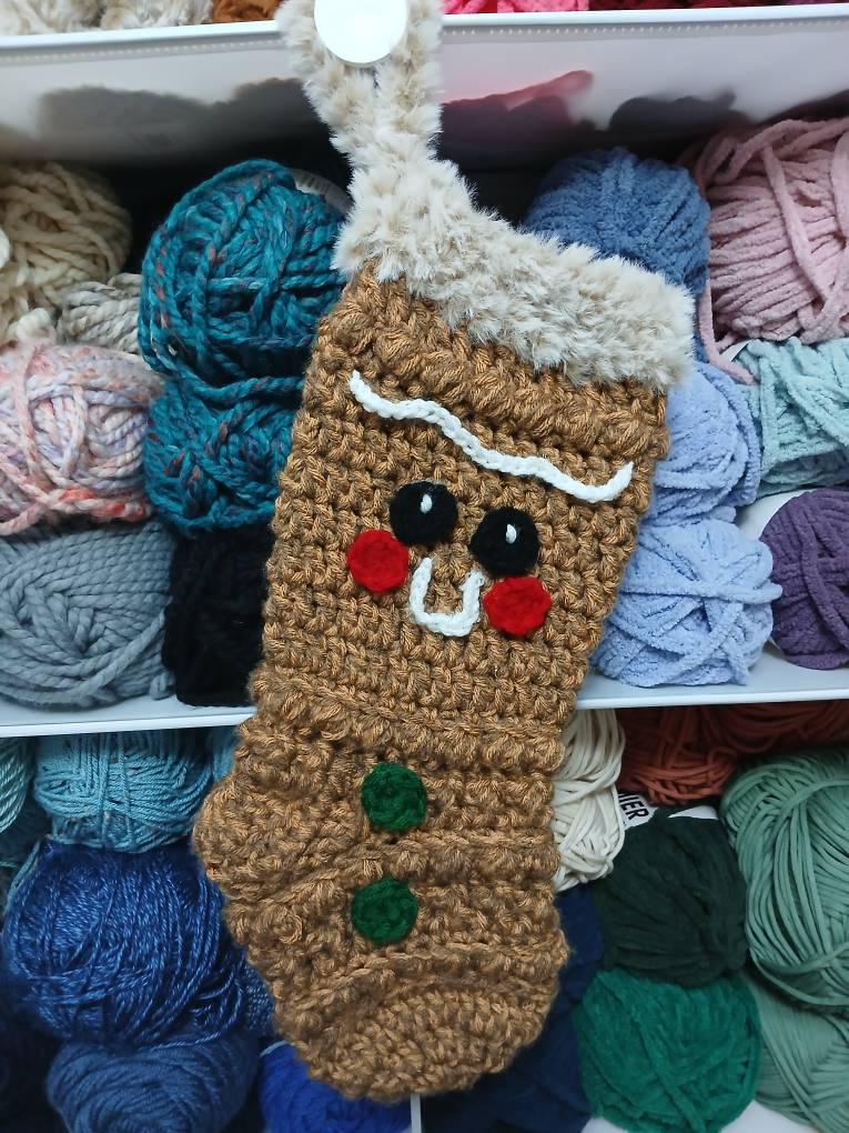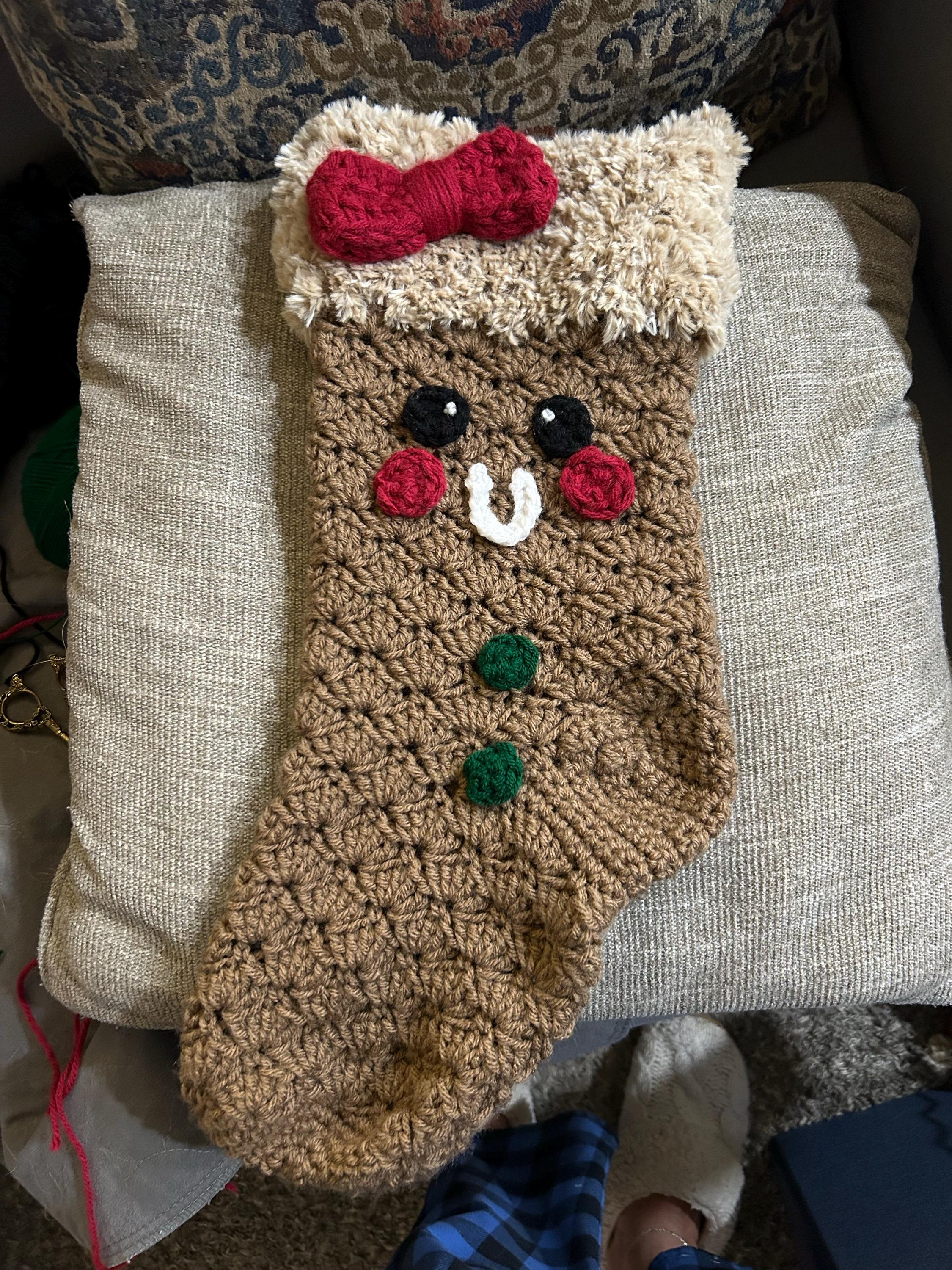 I didn’t use the stocking here because I am following a stocking pattern for my nieces family but used the information on the fur part and actual ginger bread idea and attachments. It came out so cute.