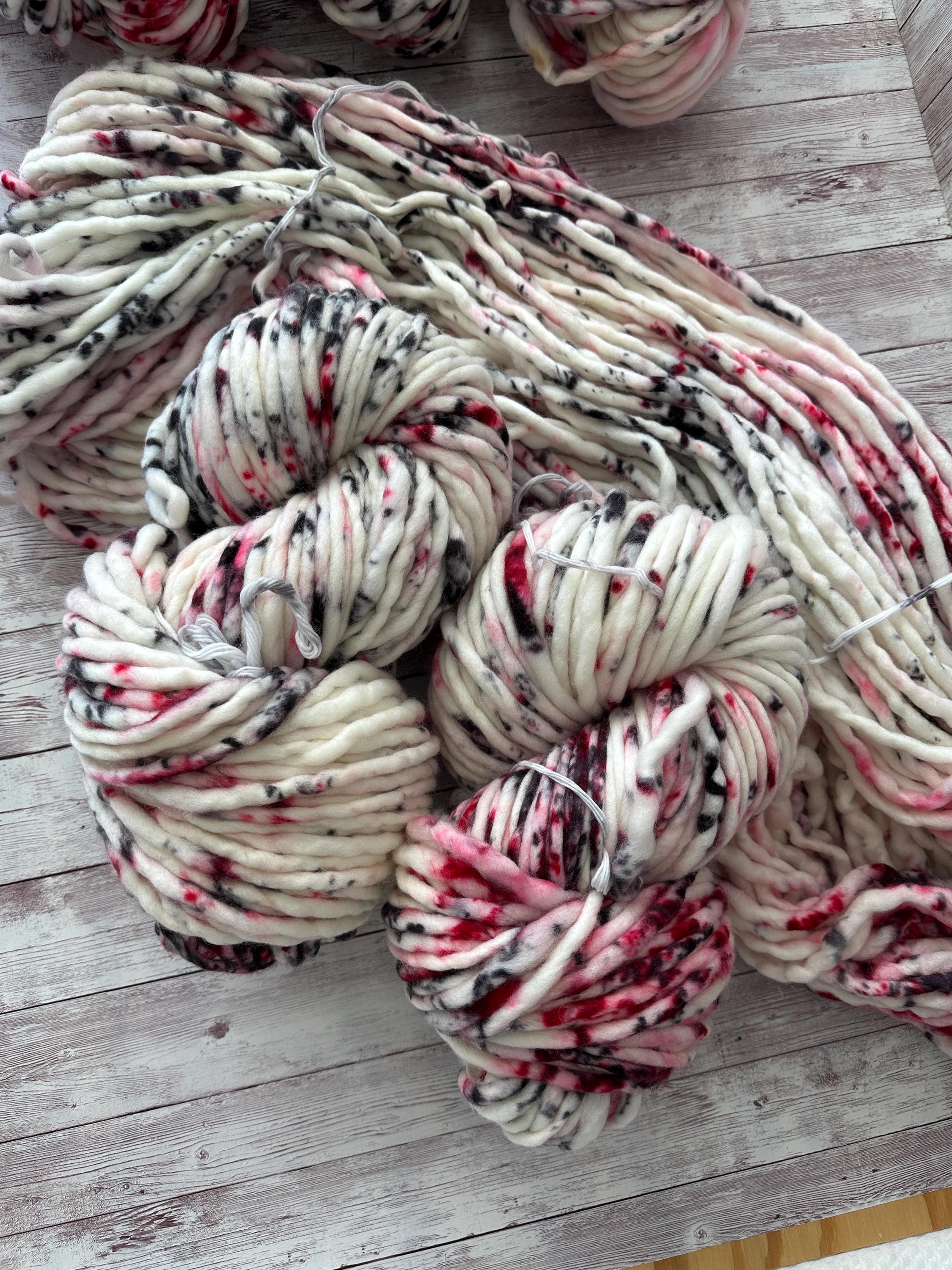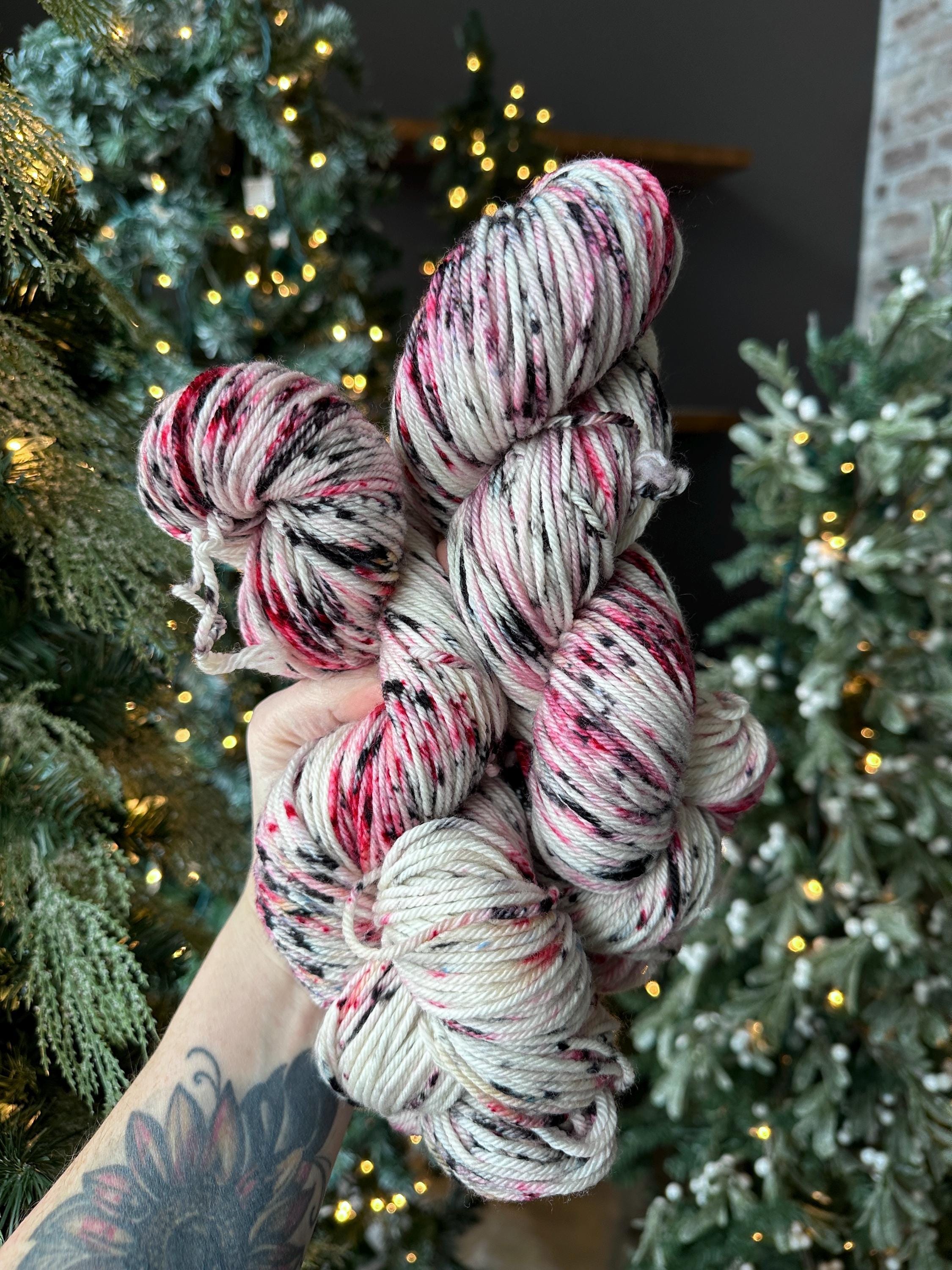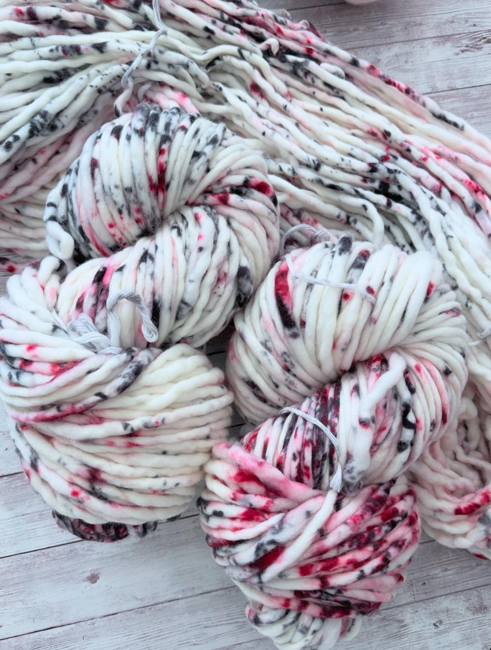 Add some drama to your next project with True Crime Junkie — a striking hand-dyed yarn featuring bold red and black speckles across a crisp white base. This colorway is perfect for knitters and crocheters who love unique indie-dyed yarns with personality. Each skein is one-of-a-kind, creating gorgeous pops of color in every stitch.