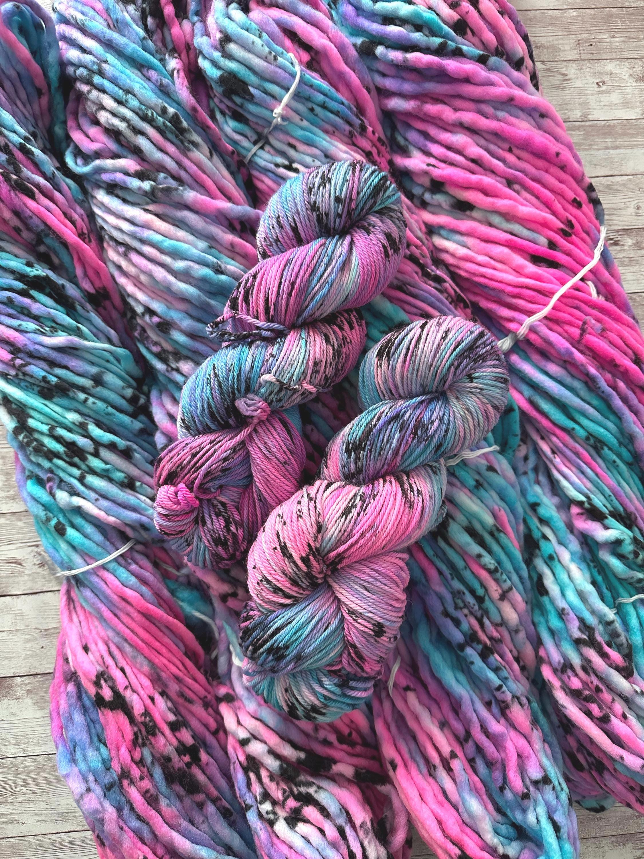 Sweet and bold, Cotton Candy mixes bright pinks and vibrant teals with striking black speckles. This playful hand-dyed yarn is eye-catching and fun, perfect for statement projects that bring a mix of whimsy and contrast.