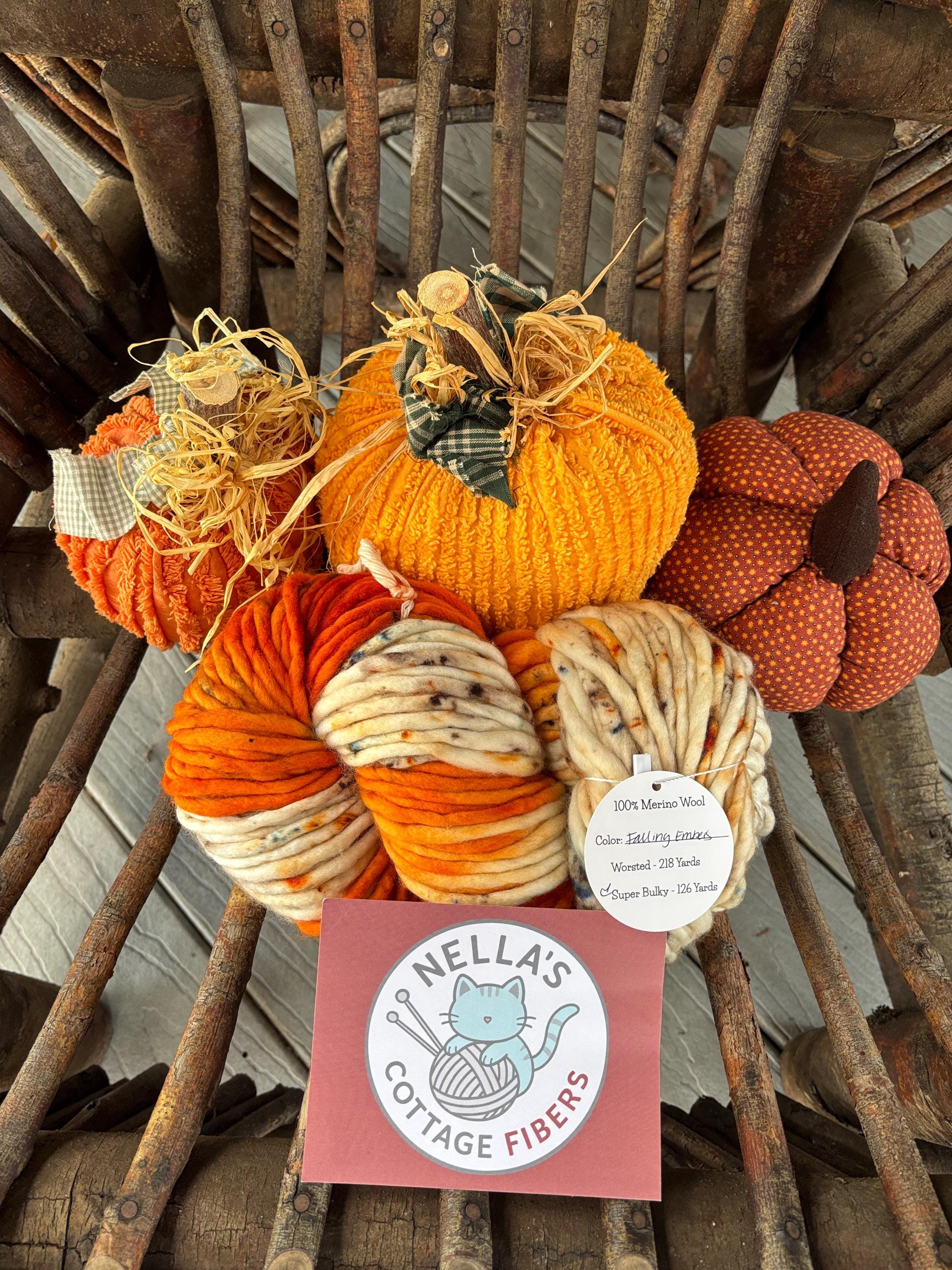 Cozy and warm, Falling Embers is inspired by glowing firelight and autumn leaves. This hand-dyed yarn features a blend of rich oranges, earthy browns, and soft sage green, making it a perfect choice for fall projects or timeless heirloom pieces.