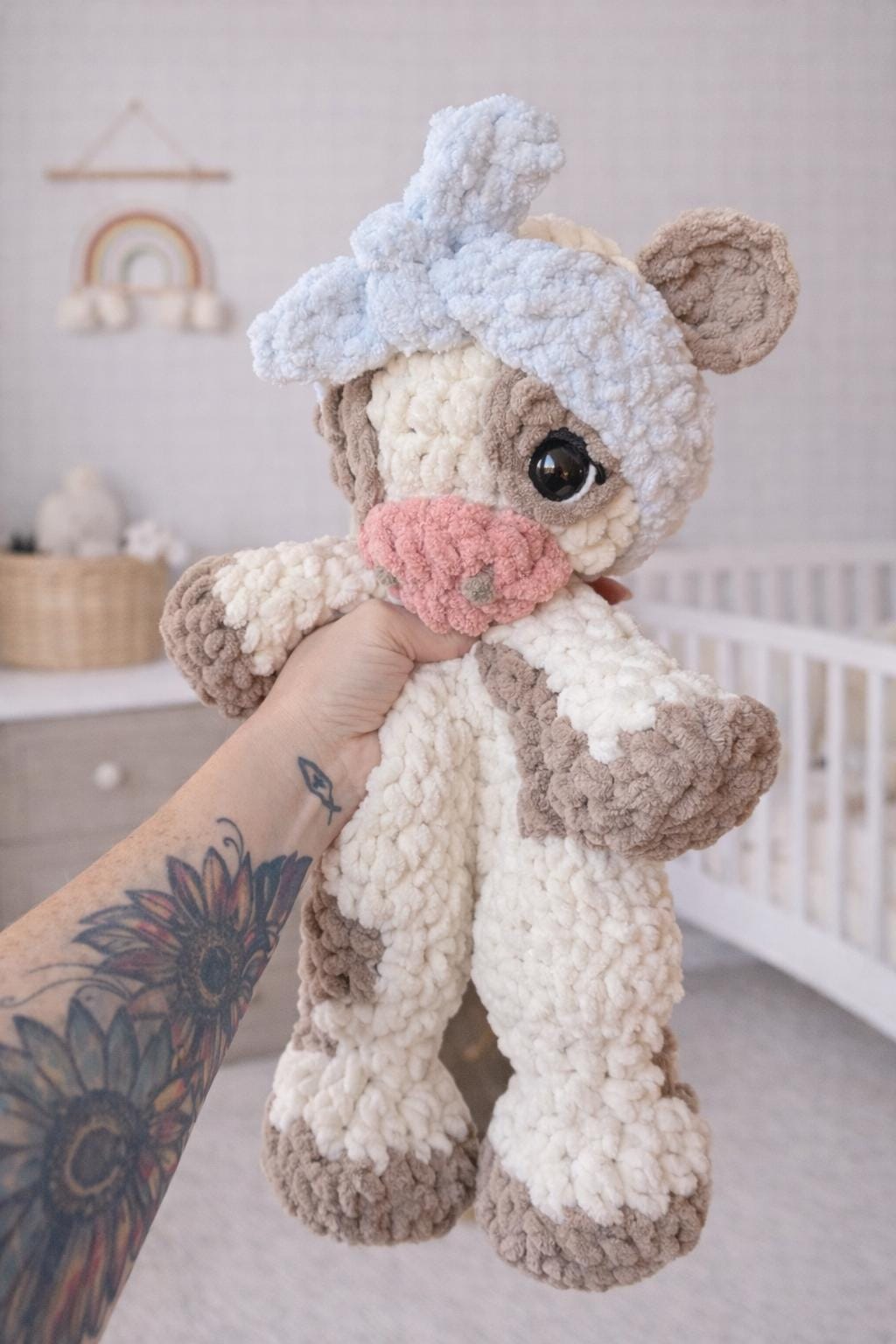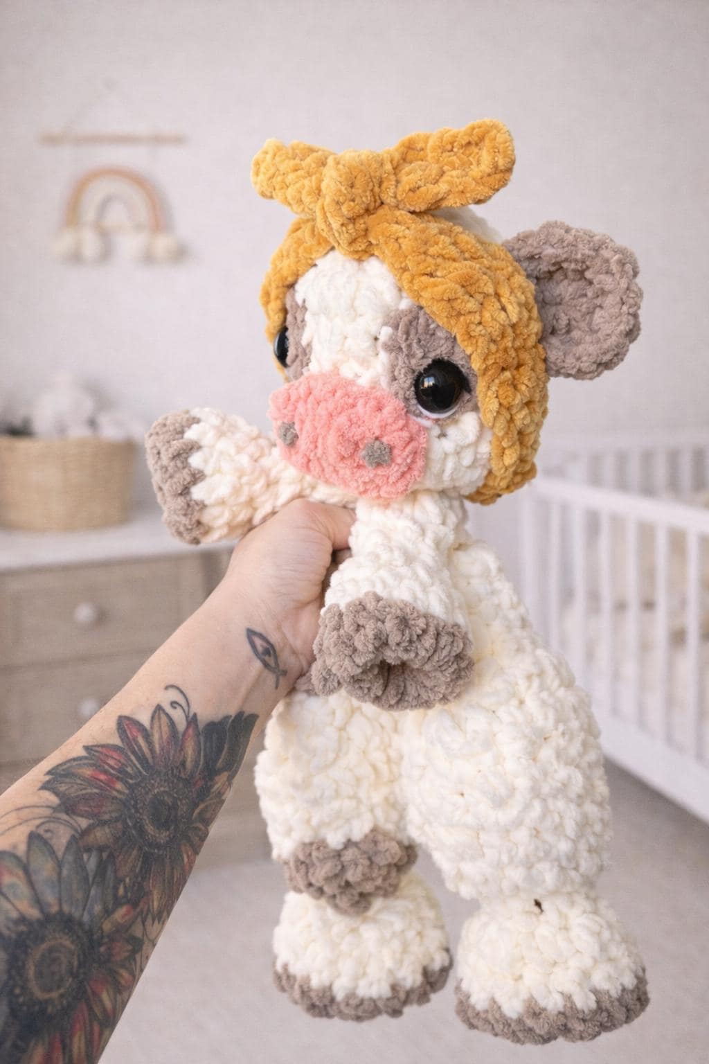 The snuggler cow is just so adorable. The workmanship is outstanding! So much detail and time spent creating this. Customer service is outstanding as well. I would definitely order from Nella’s Cottage again.