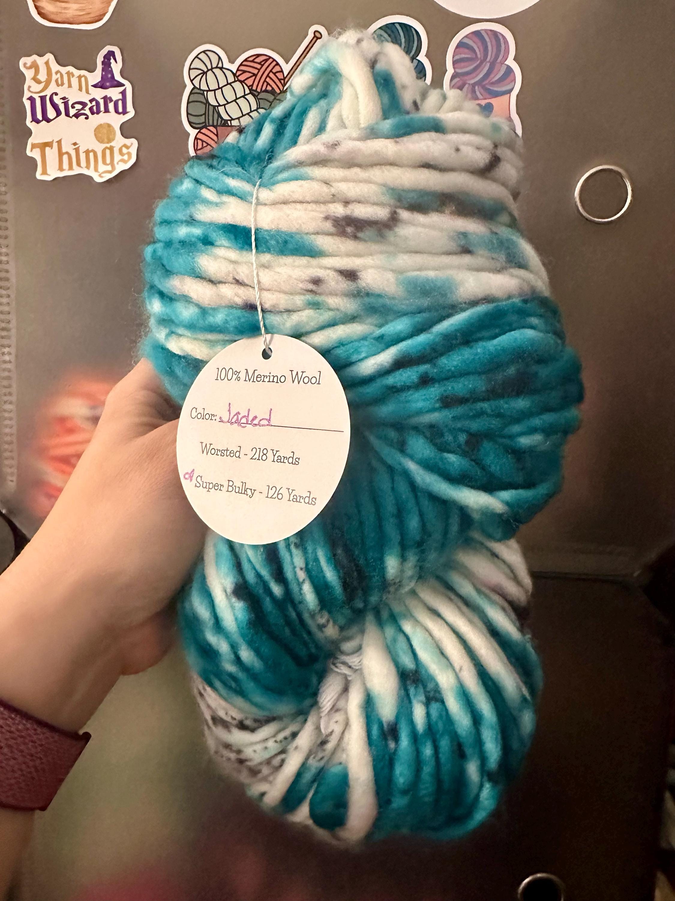 Striking and moody, Jaded is a bold hand-dyed yarn featuring a rich teal base accented with black speckles. This dramatic colorway adds depth and texture to every stitch, making it perfect for statement pieces and modern handmade projects.