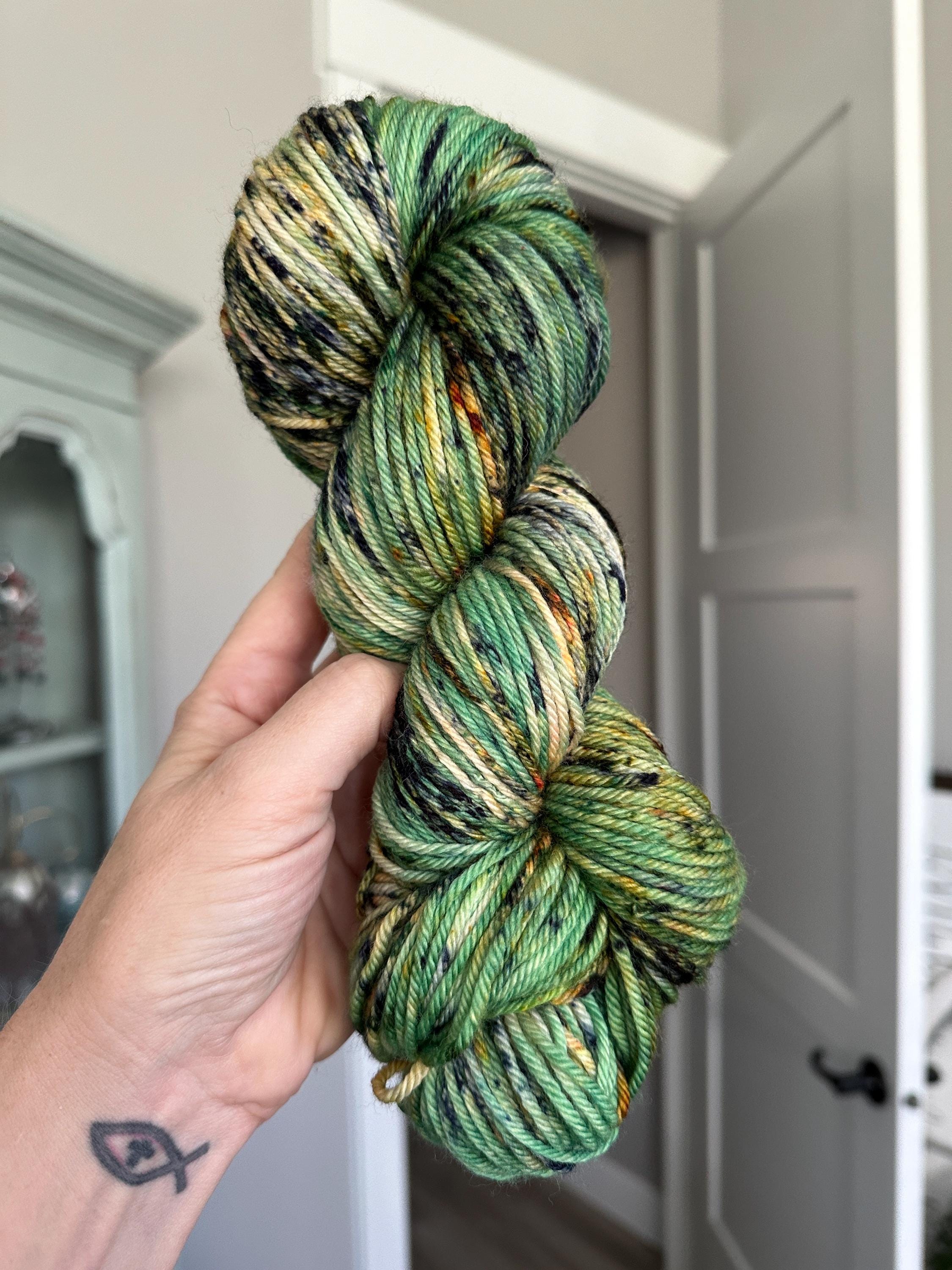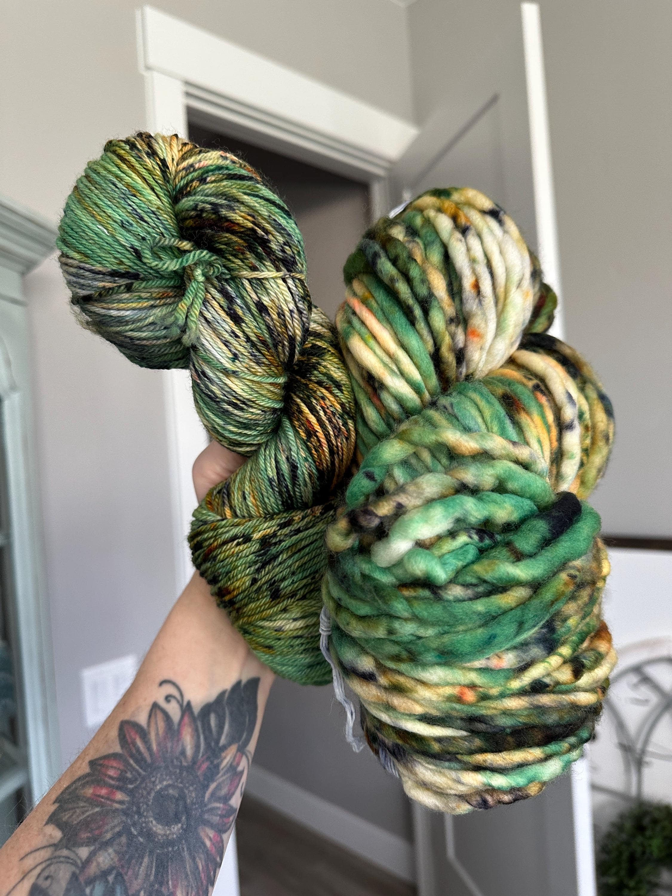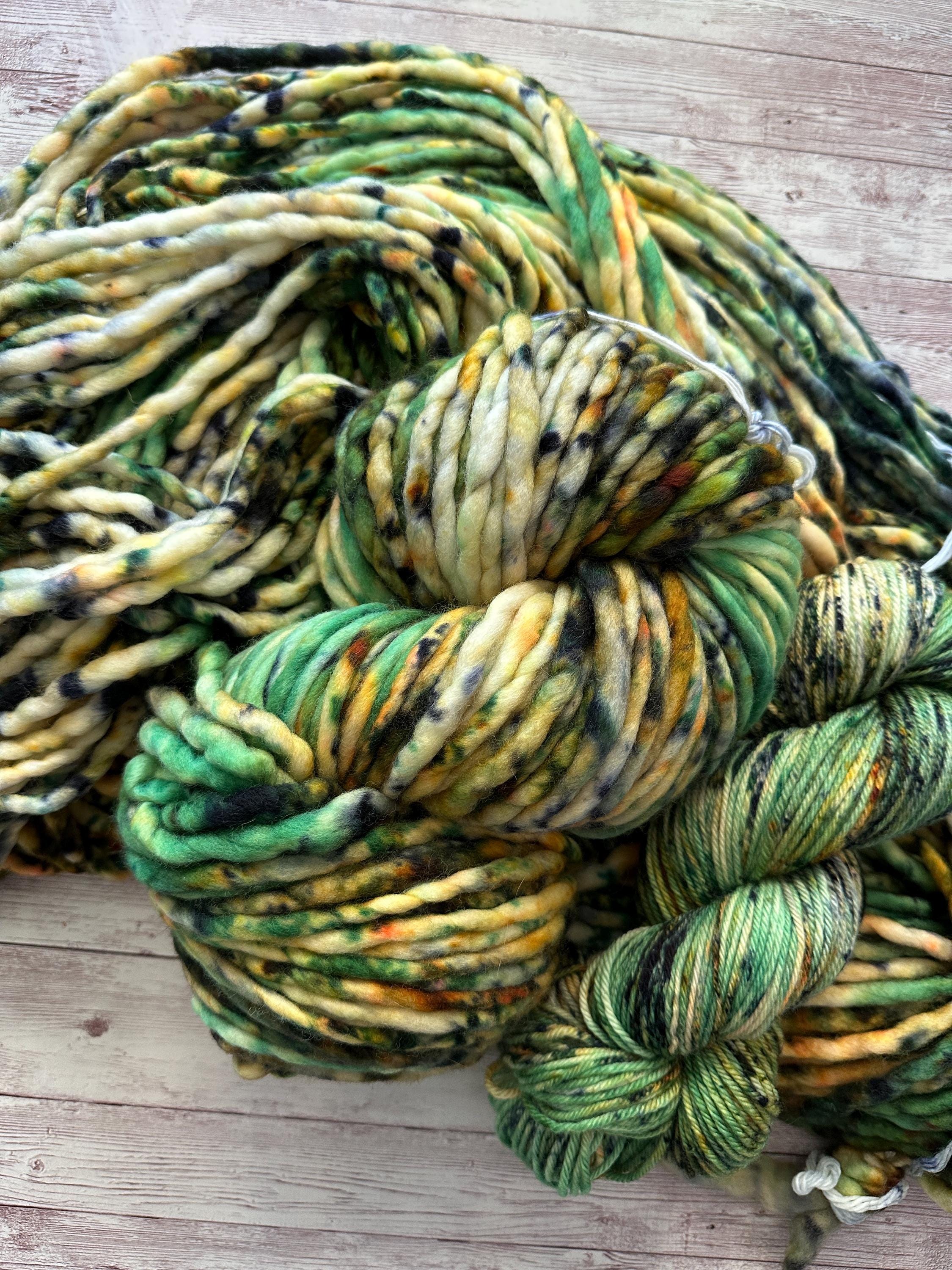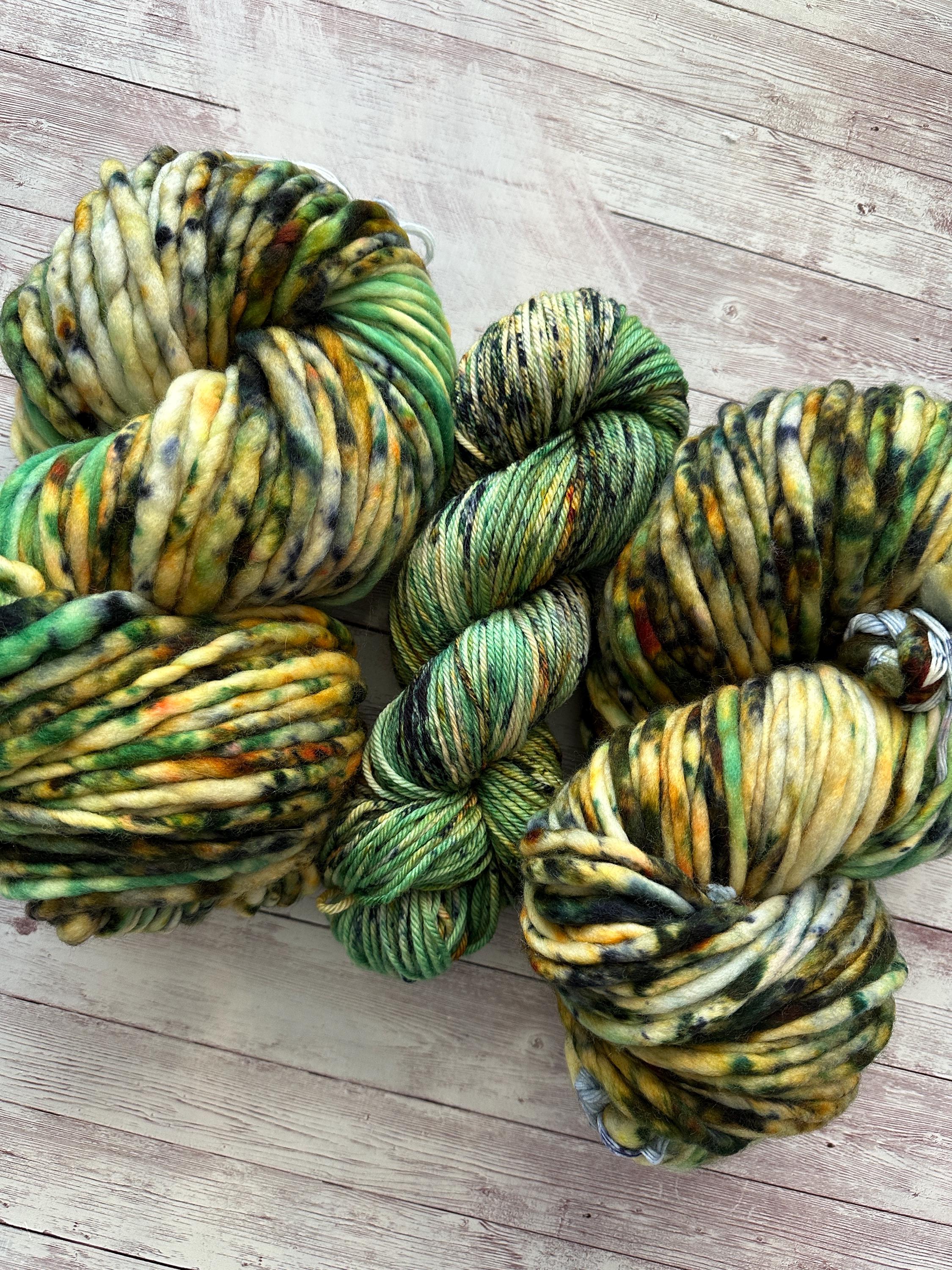 Fresh and earthy, Jasper is inspired by the autumn beauty of changing trees. This hand-dyed yarn features a golden yellow base layered with rich green shades, with navy and orange speckles, creating a natural, grounding palette for timeless handmade projects.