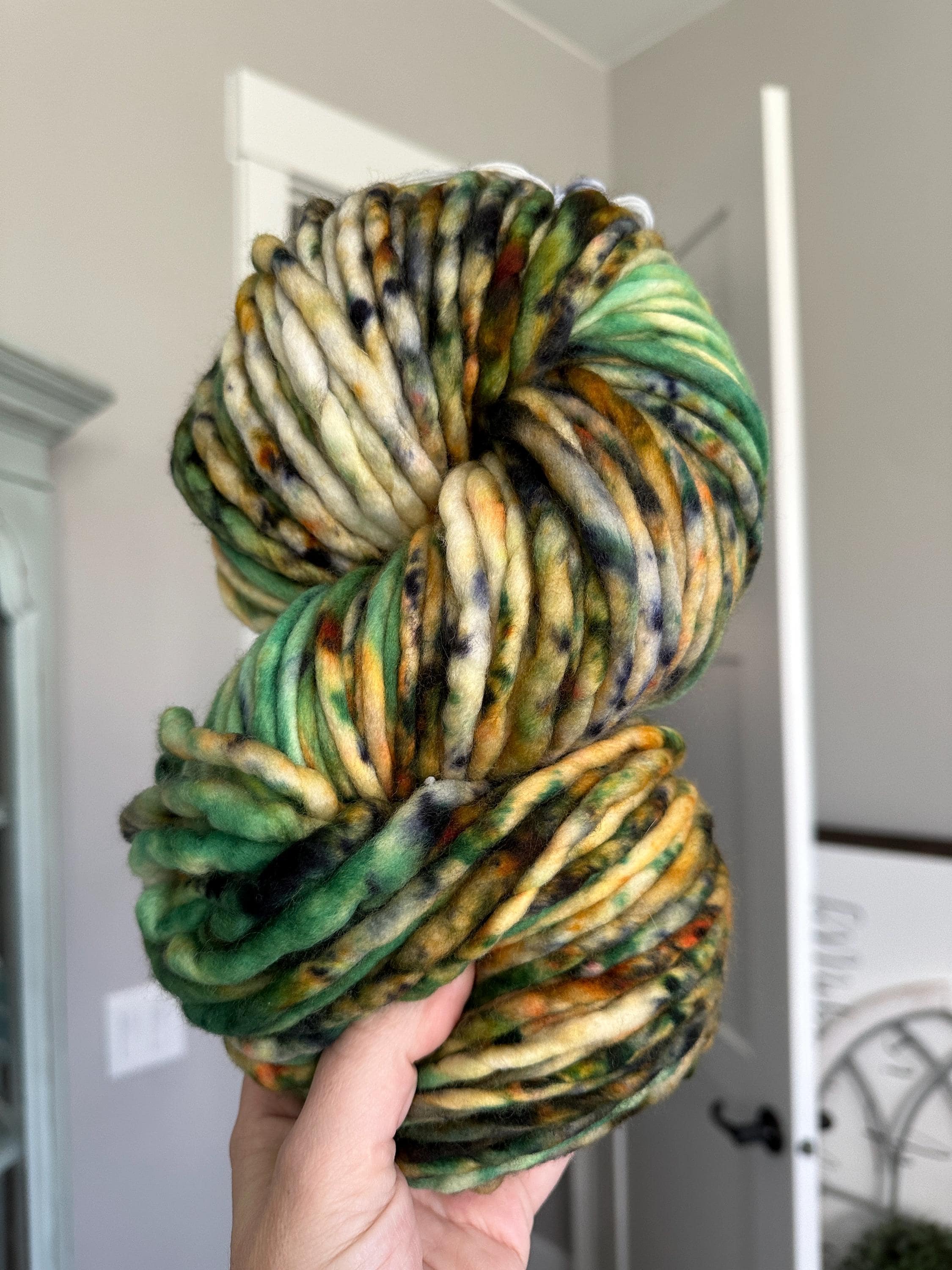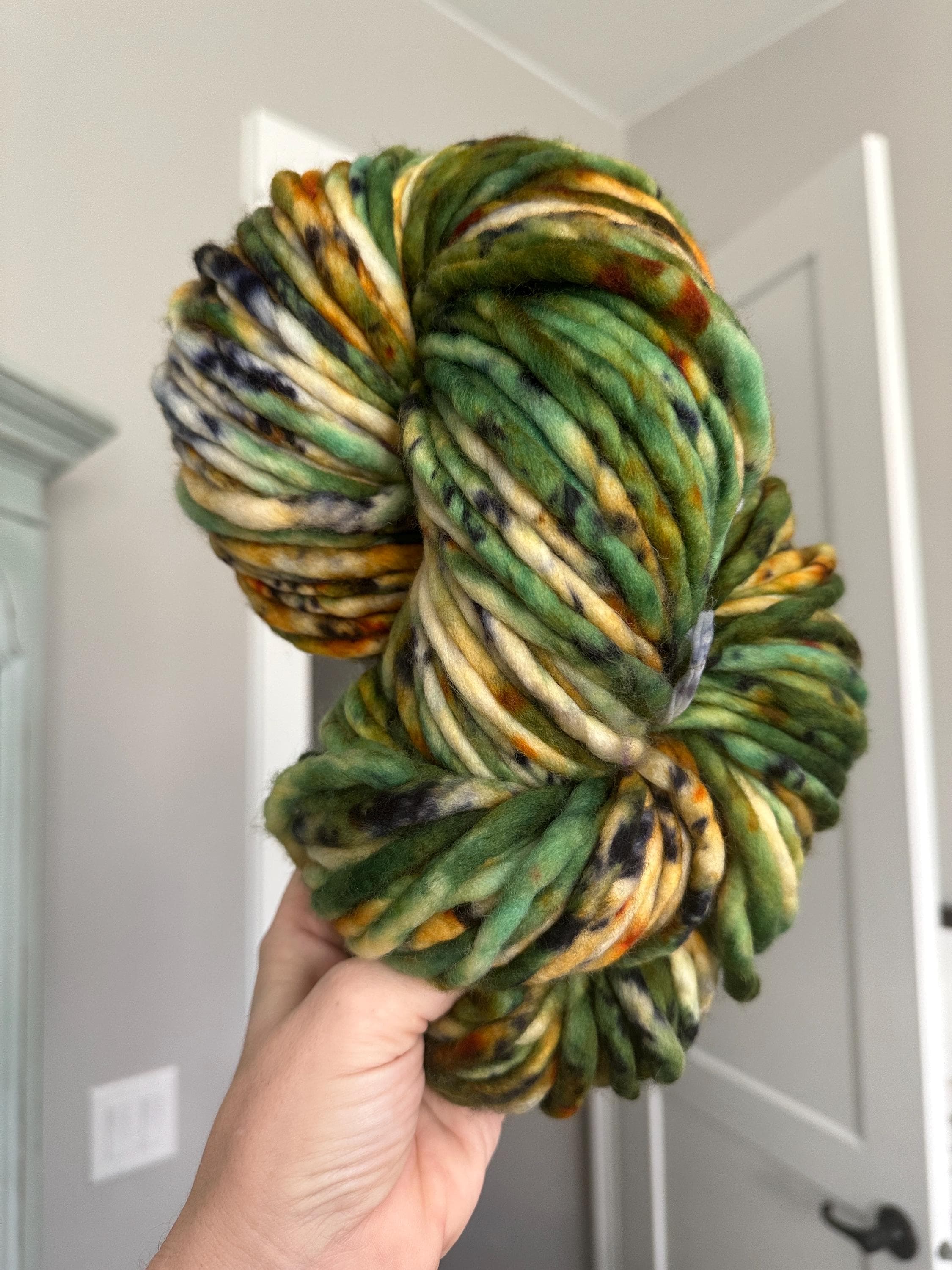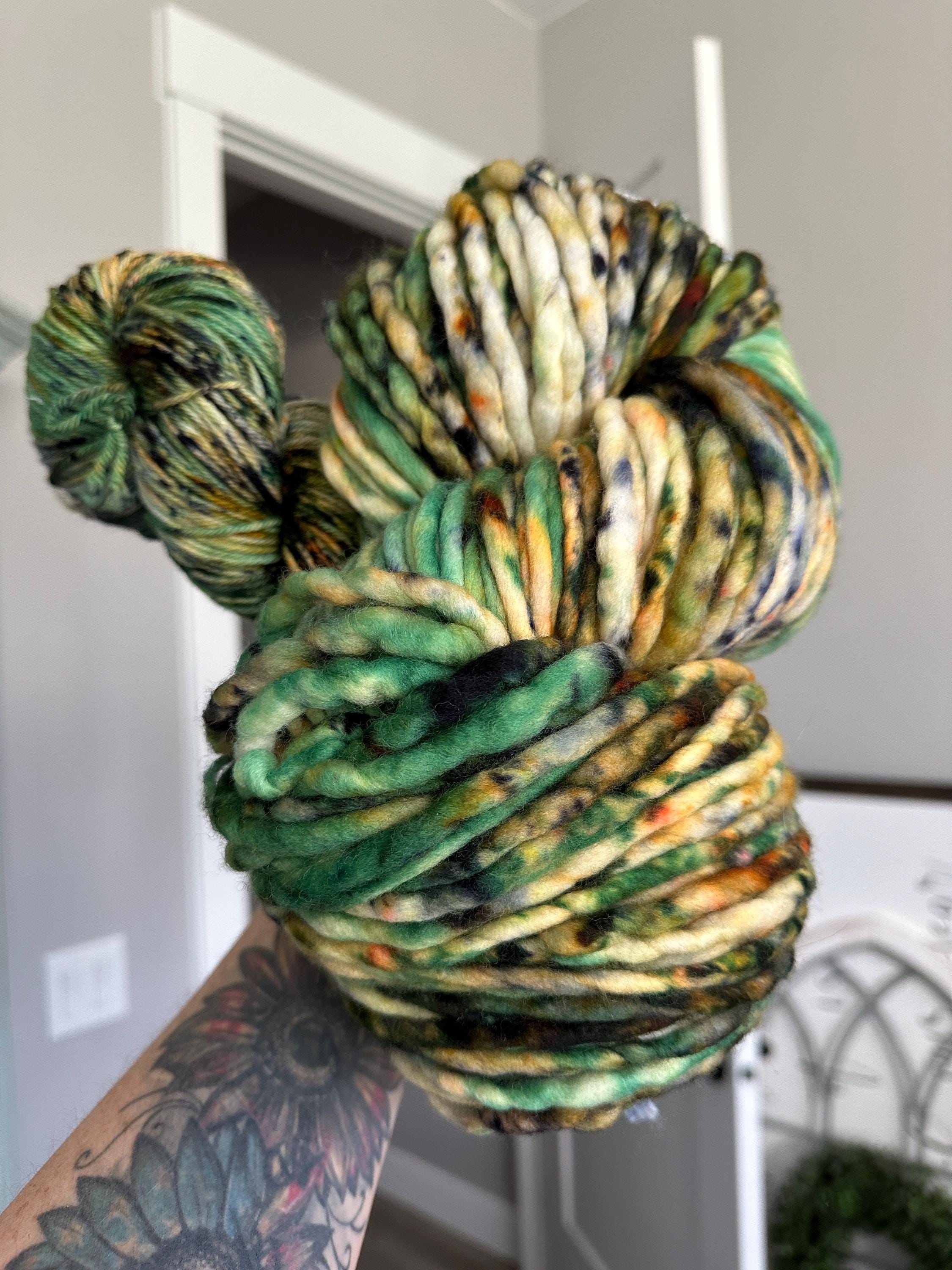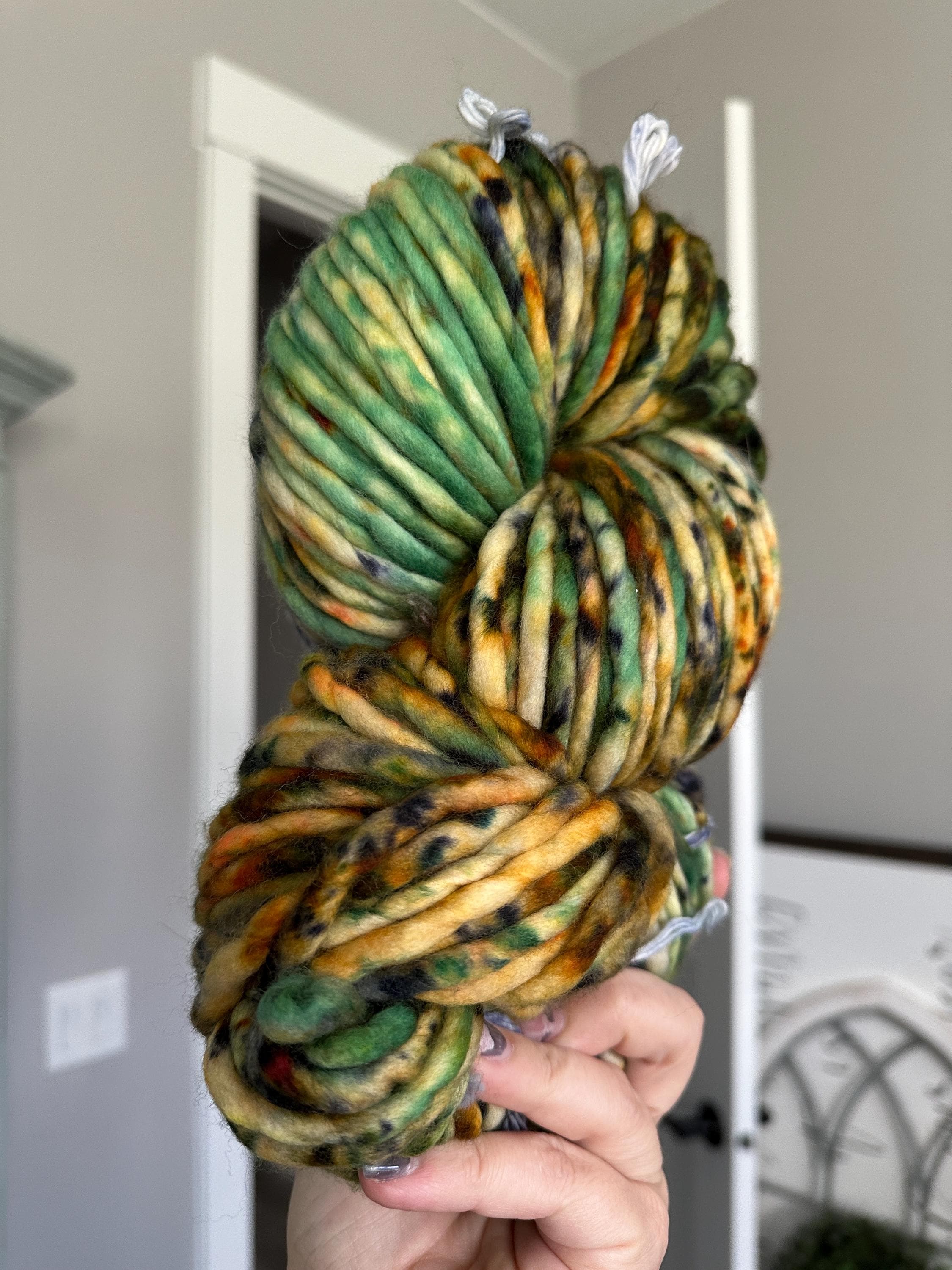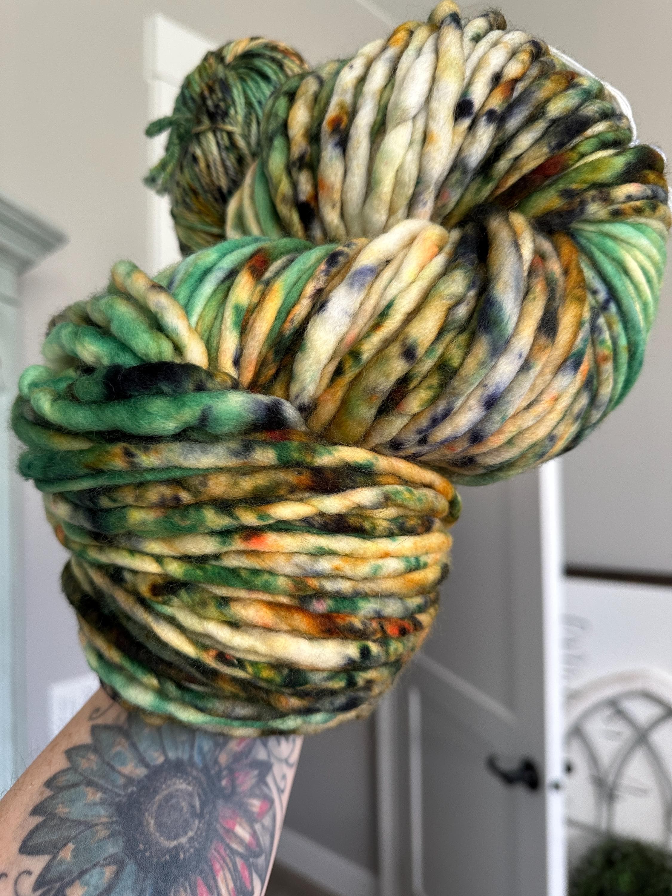 Fresh and earthy, Jasper is inspired by the autumn beauty of changing trees. This hand-dyed yarn features a golden yellow base layered with rich green shades, with navy and orange speckles, creating a natural, grounding palette for timeless handmade projects.