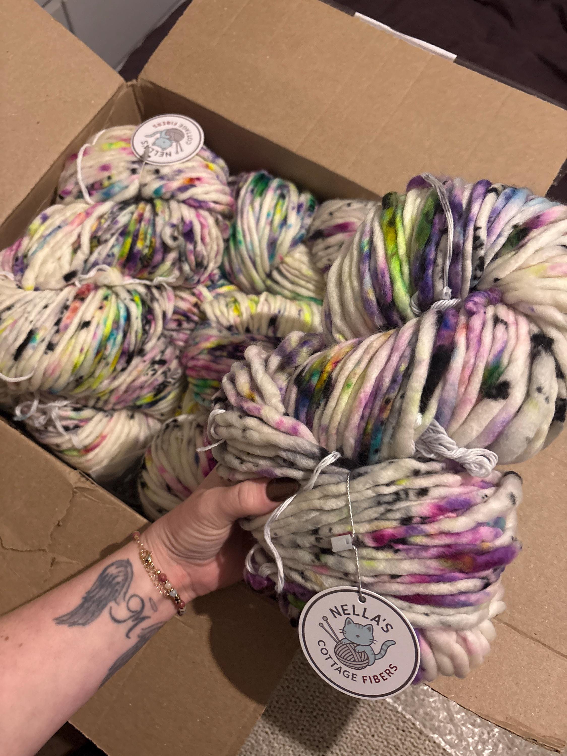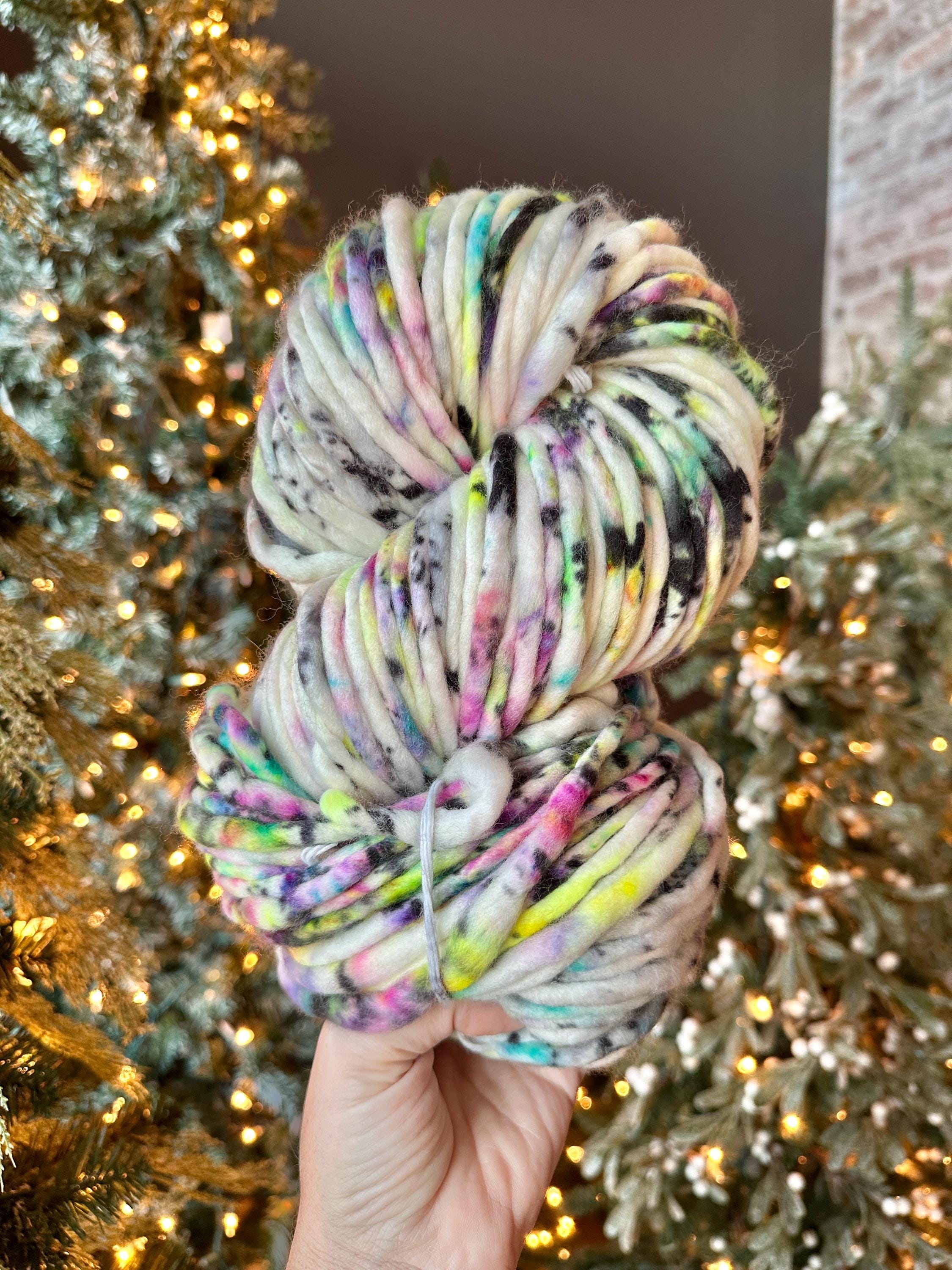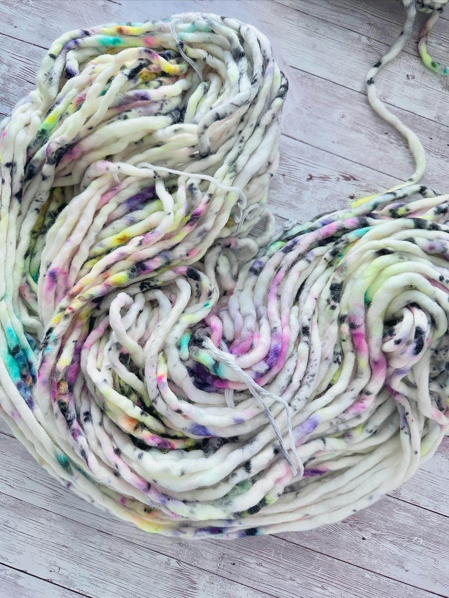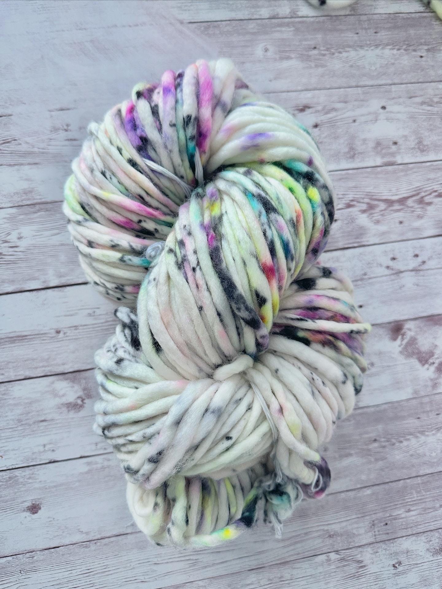 Fun and Playful, Troll Sprinkles is all the 90’s era vibes!! A white base yarn, with sprinkles of jewel tones and neons, finished off with specks of black for that abstract mood you’re looking to give your knit and crochet projects!