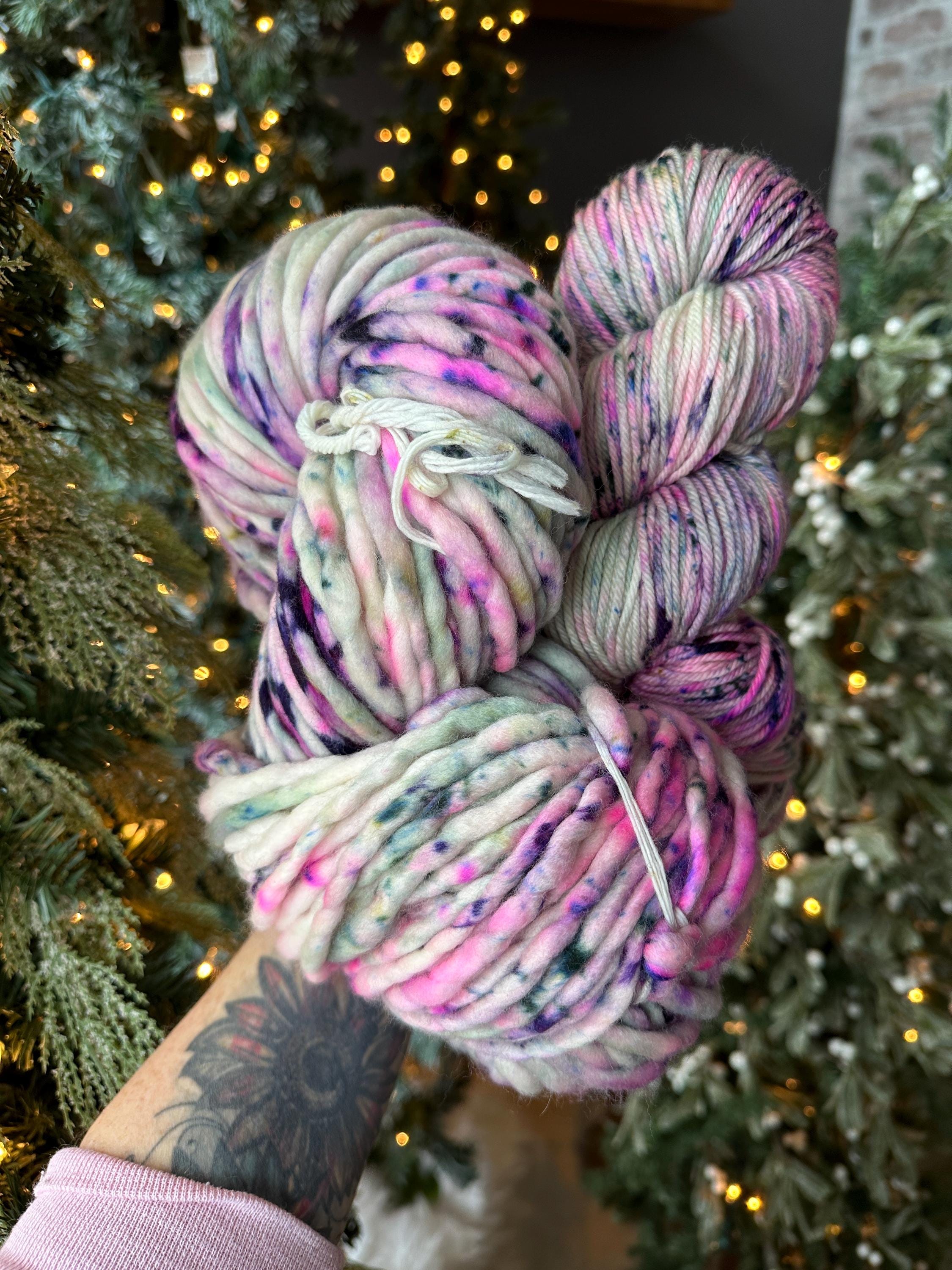 Name TBD: a soft pastel sage green with sprinkles of purples! The perfect spring color, ready to be knit or crocheted into your turn-of-the-season garments!