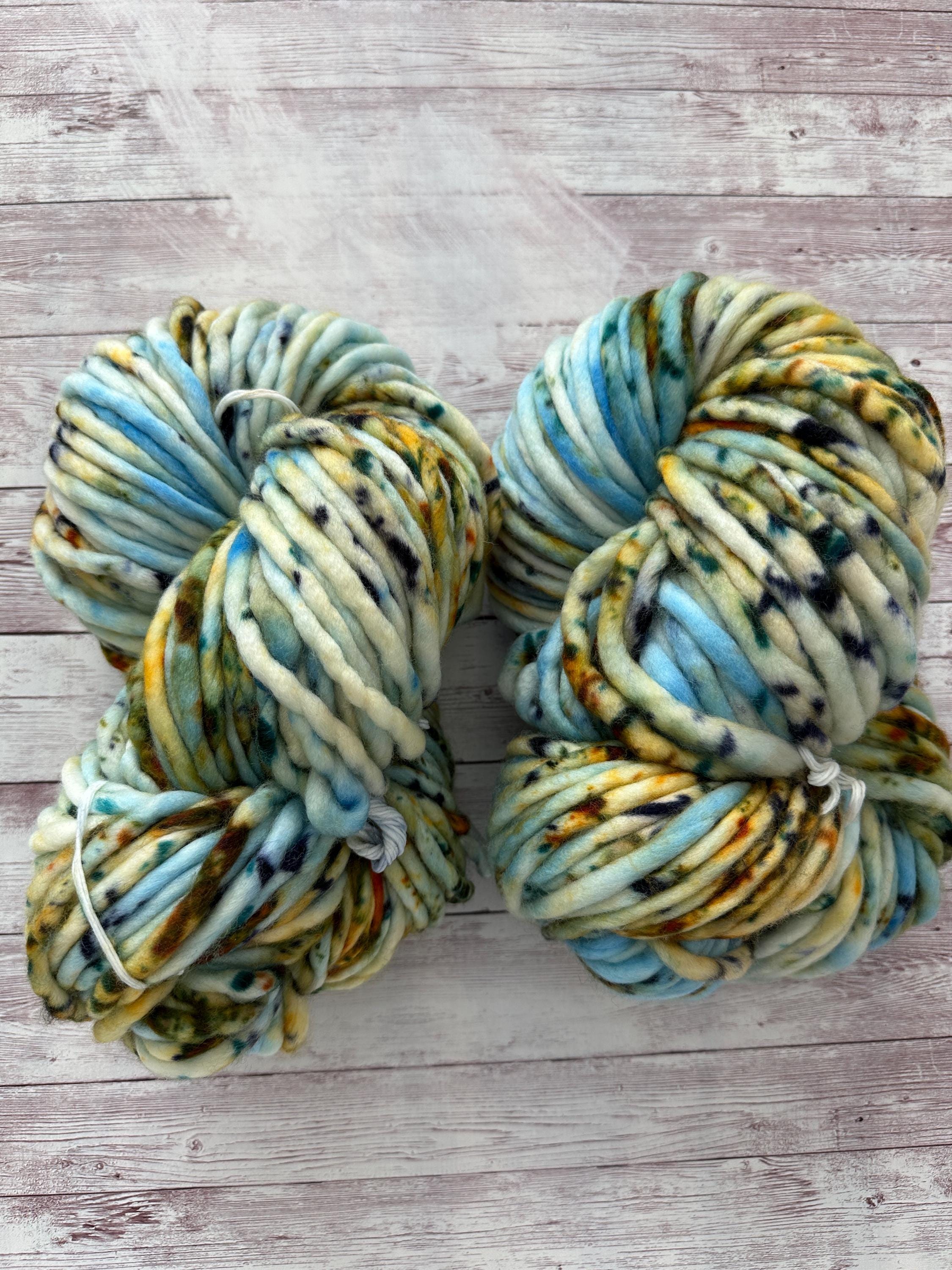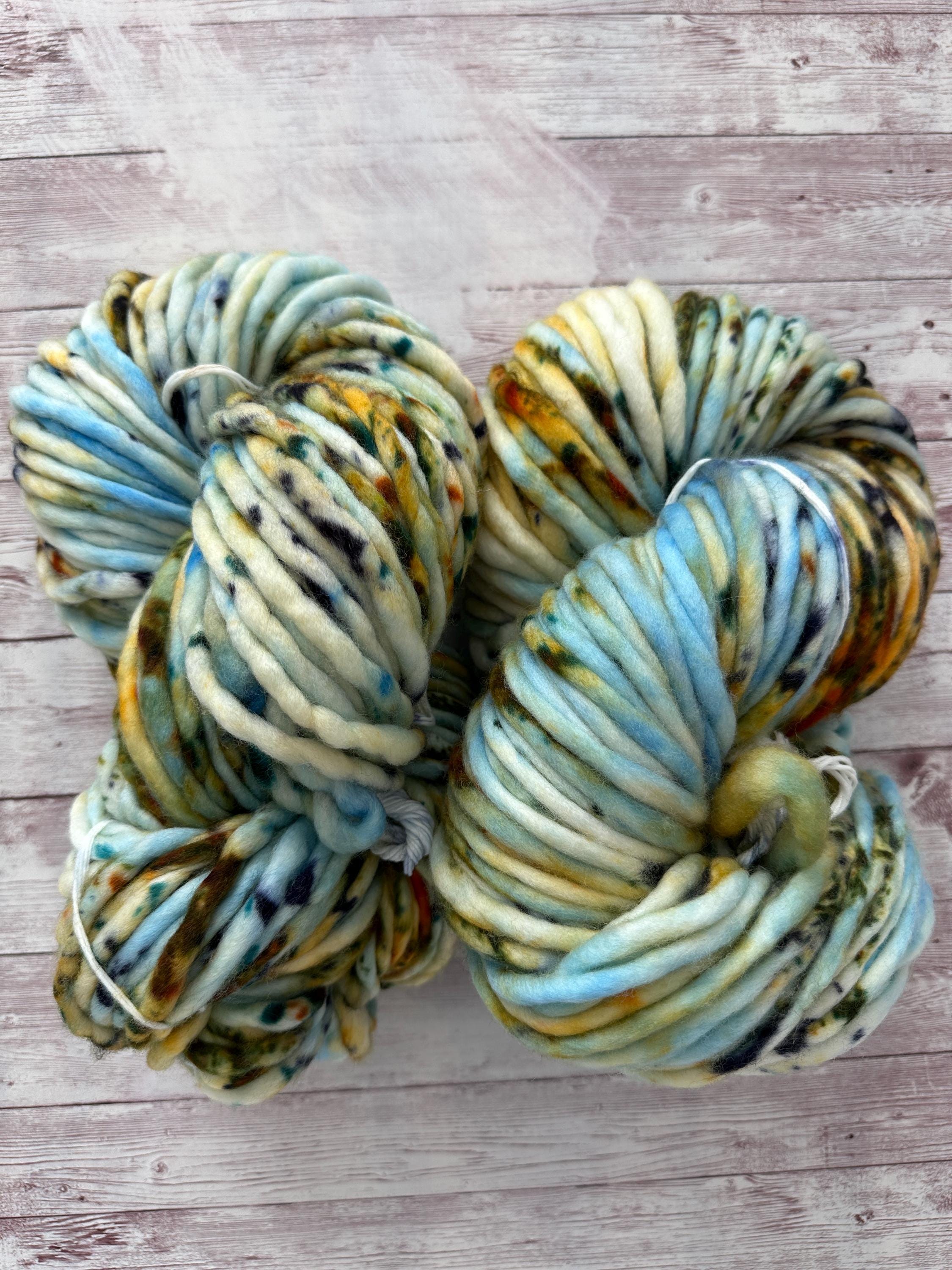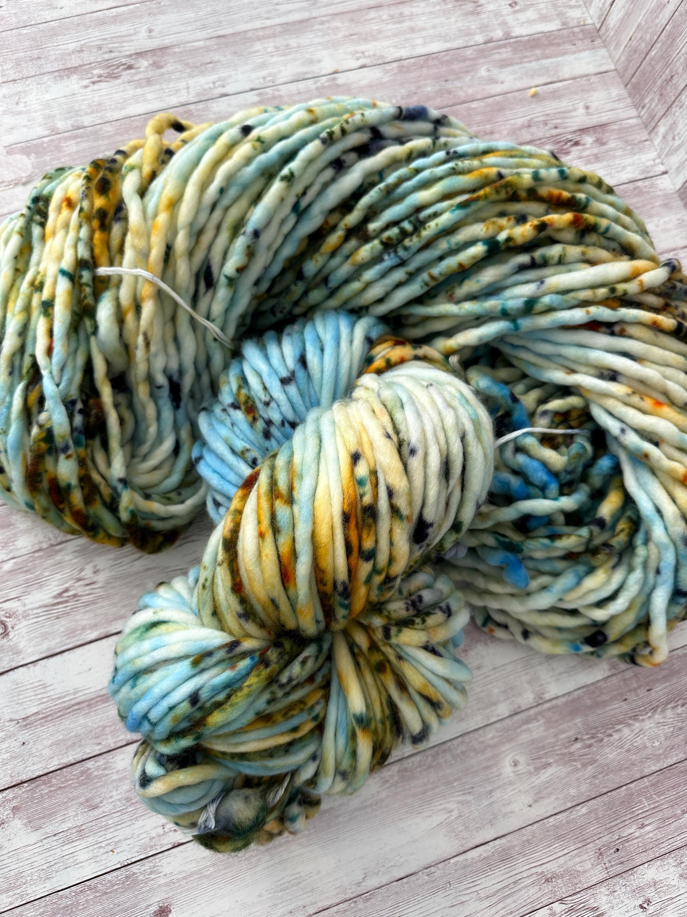 Soft and kinda moody, Atlantis is named after mysterious oceans and underwater treasures. This hand-dyed yarn blends soft blues with flecks of vibrant golds, greens, oranges and navy!