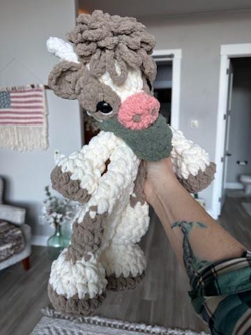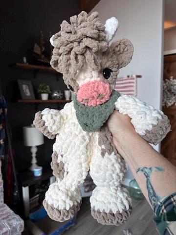 This little cutie measures approximately 16” tall from top of head to bottom of feet, and approximately 10” wide at the widest part of the head. Color of Bandana is customizable.