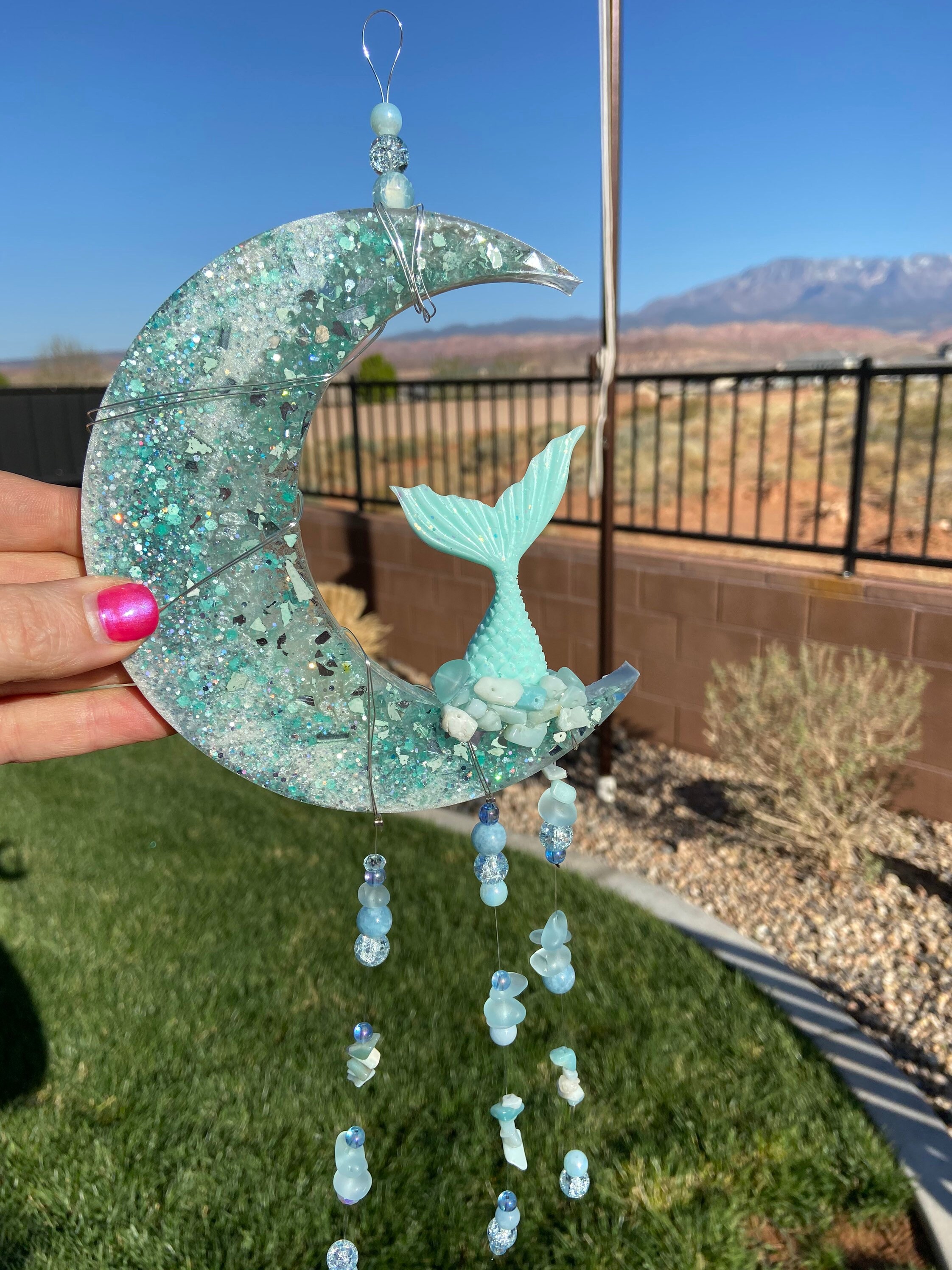 - Moon measures about 6" tall, and the dangles vary in length from 6"-10".
